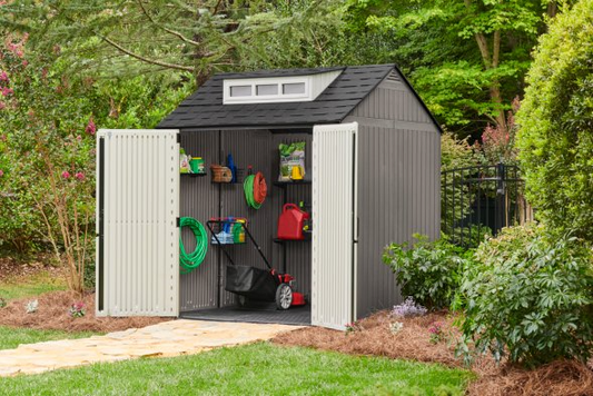 Rubbermaid® 7x7 Easy Install Resin Storage Shed – Durable Outdoor Garden Shed with Lockable Doors (Brown/Gray)