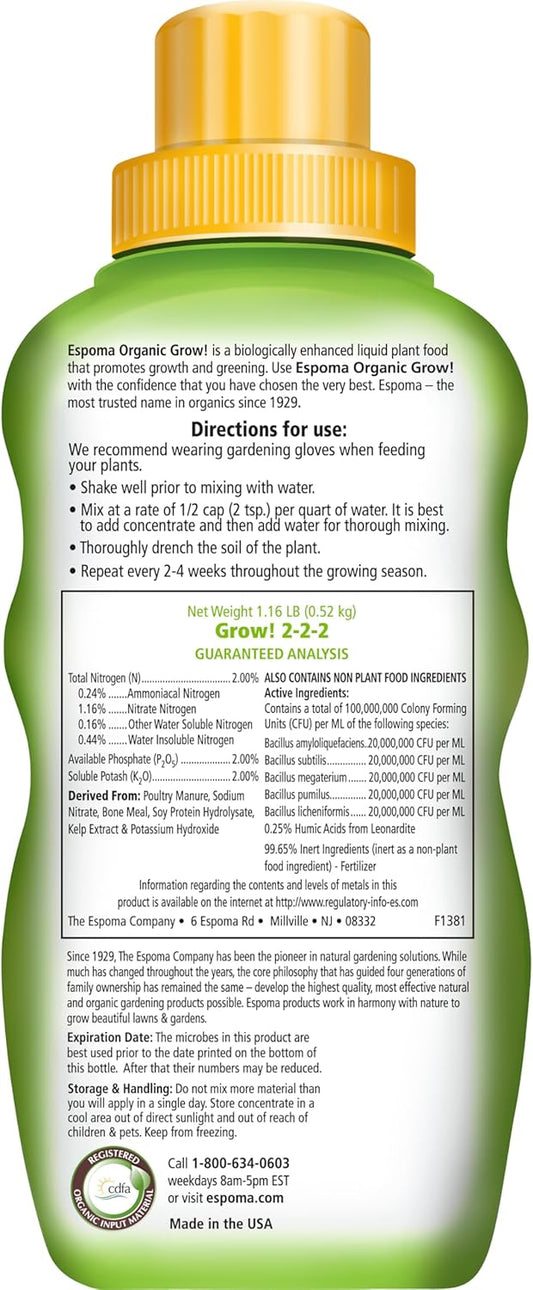 Espoma Organic Grow! 2-2-2 Liquid Plant Food – All-Purpose Fertilizer for Indoor & Outdoor Plants – 16oz Concentrate
