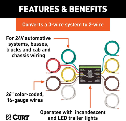 CURT 56424 24-Volt Splice-In Trailer Tail Light Converter for Trucks, Buses & Cab Chassis – Heavy-Duty