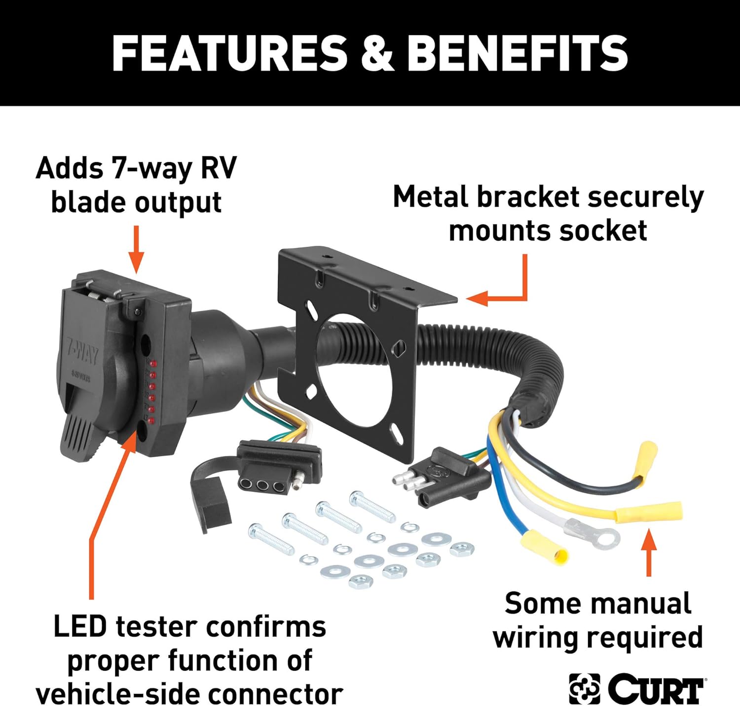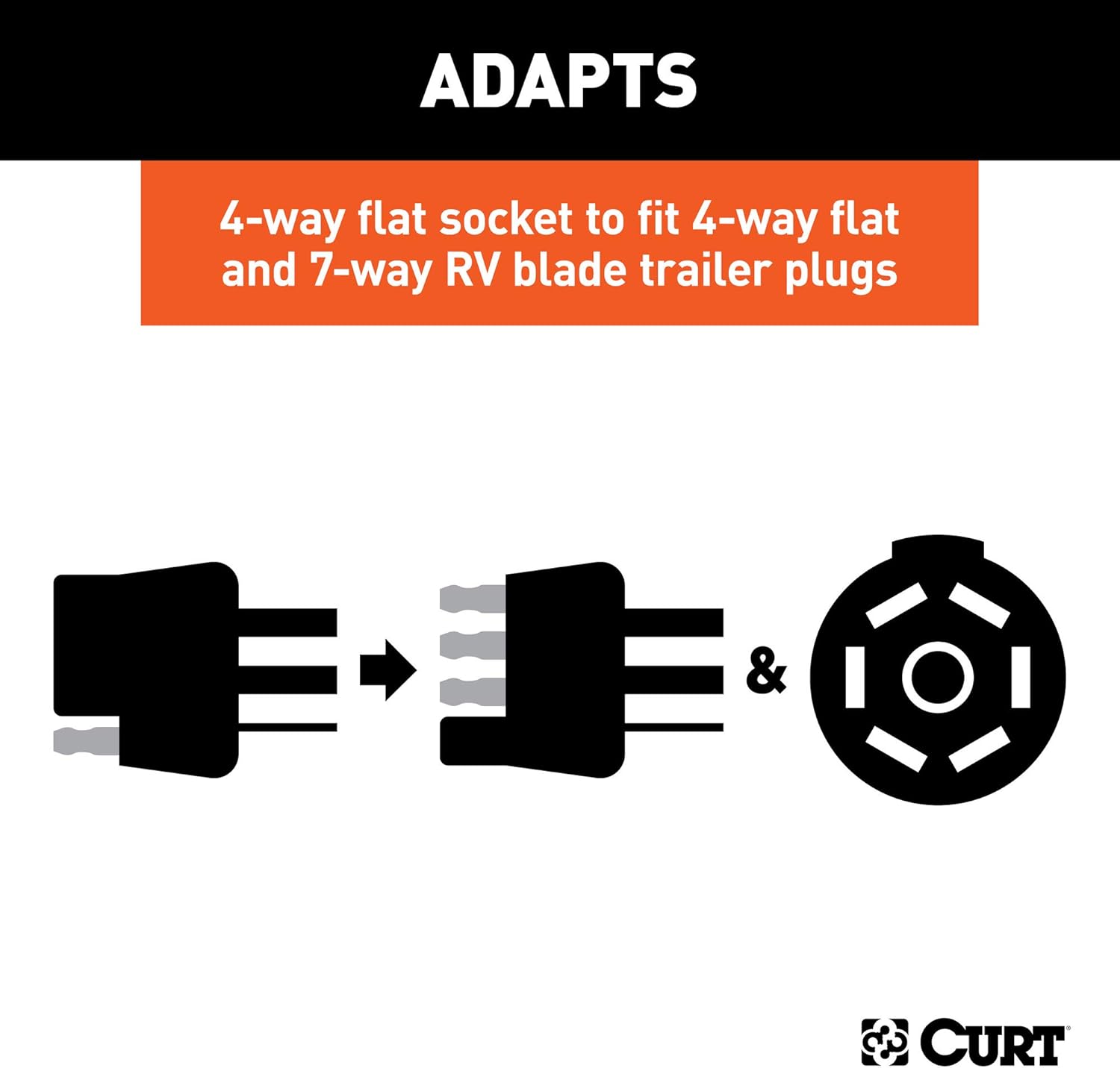 The Curt Manufacturing 57674 adapter allows you to split a 4-way flat trailer wiring into both a 7-way round and a second 4-way flat connection. This makes it practical for connecting different trailer types without changing vehicle wiring.