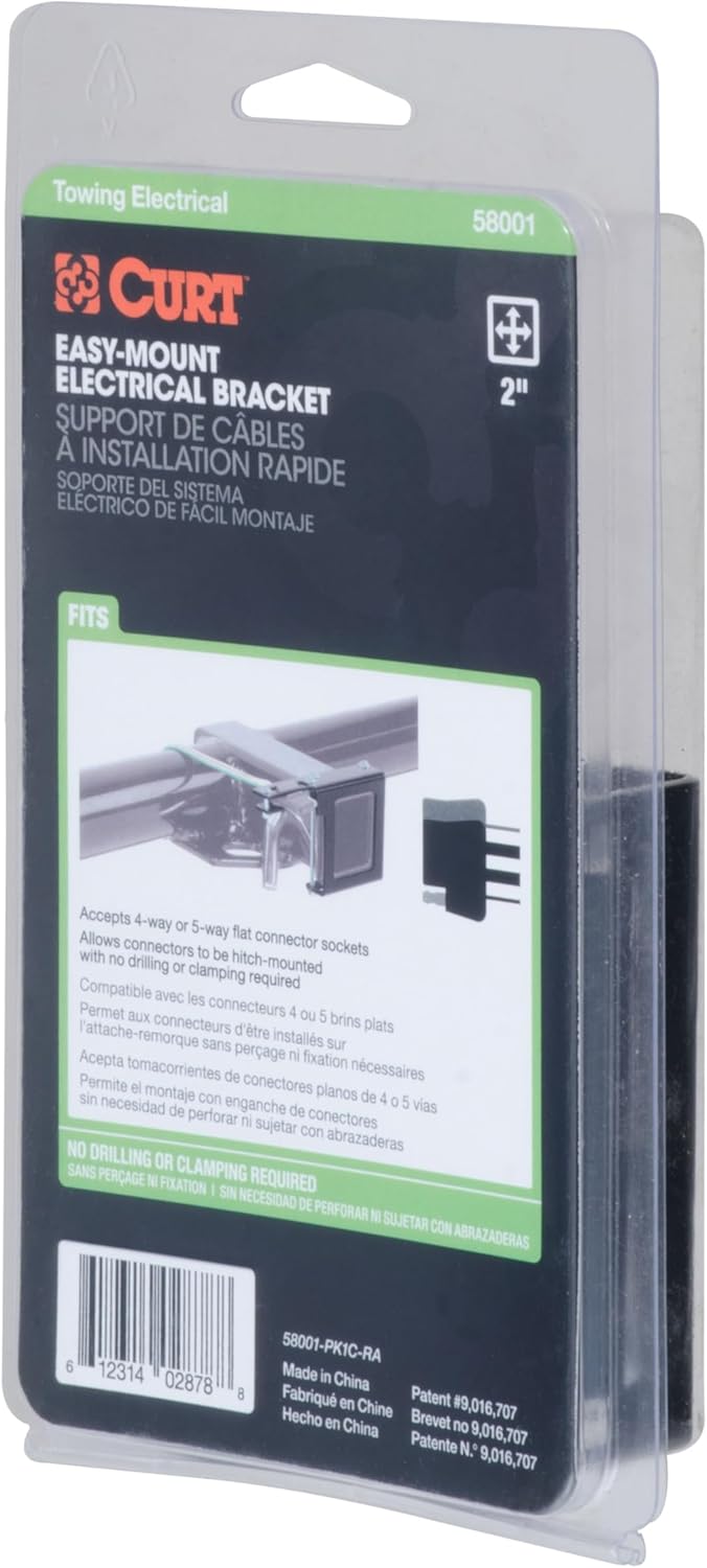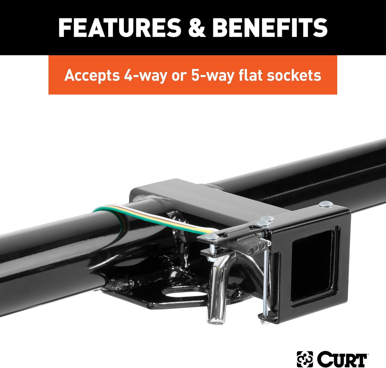 The Curt Manufacturing 58002 bracket mounts into a 1¼‑inch receiver hitch and holds both 4‑way and 5‑way flat trailer connectors. It keeps wiring secure and accessible, improving the look and function of your towing setup.