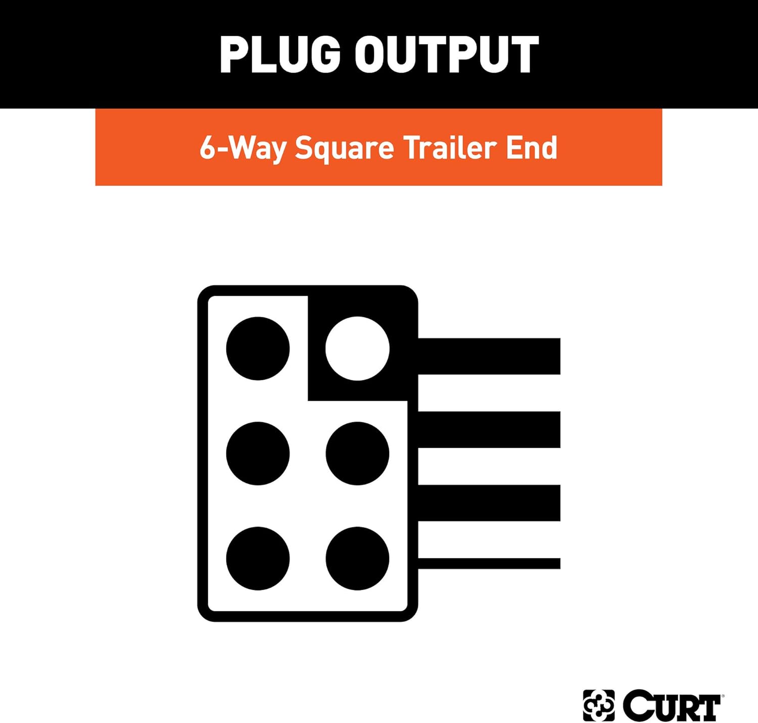 The Curt Manufacturing 58034 6-Way Square Trailer Connector includes a 12-inch loop with both vehicle and trailer ends. It provides reliable connections for tail lights, brake lights, turn signals, electric brakes, auxiliary power, and ground in a durable, weather-resistant housing.
