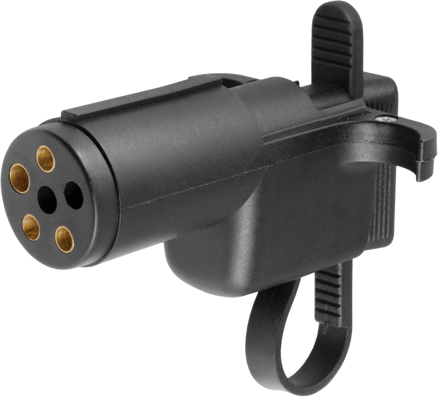 Converts a 6-way round vehicle connector to a 4-way flat trailer plug