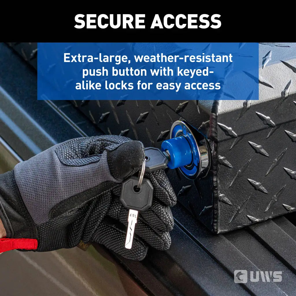 The UWS TBSD-69-PB-MB Deep Push Button Crossover Truck Toolbox offers the perfect balance of modern styling, heavy-duty protection, and easy access for serious truck owners. Built from extra-thick aluminum with a matte black powder coat finish, this 69-inch toolbox combines rugged durability with a sleek, non-reflective look.