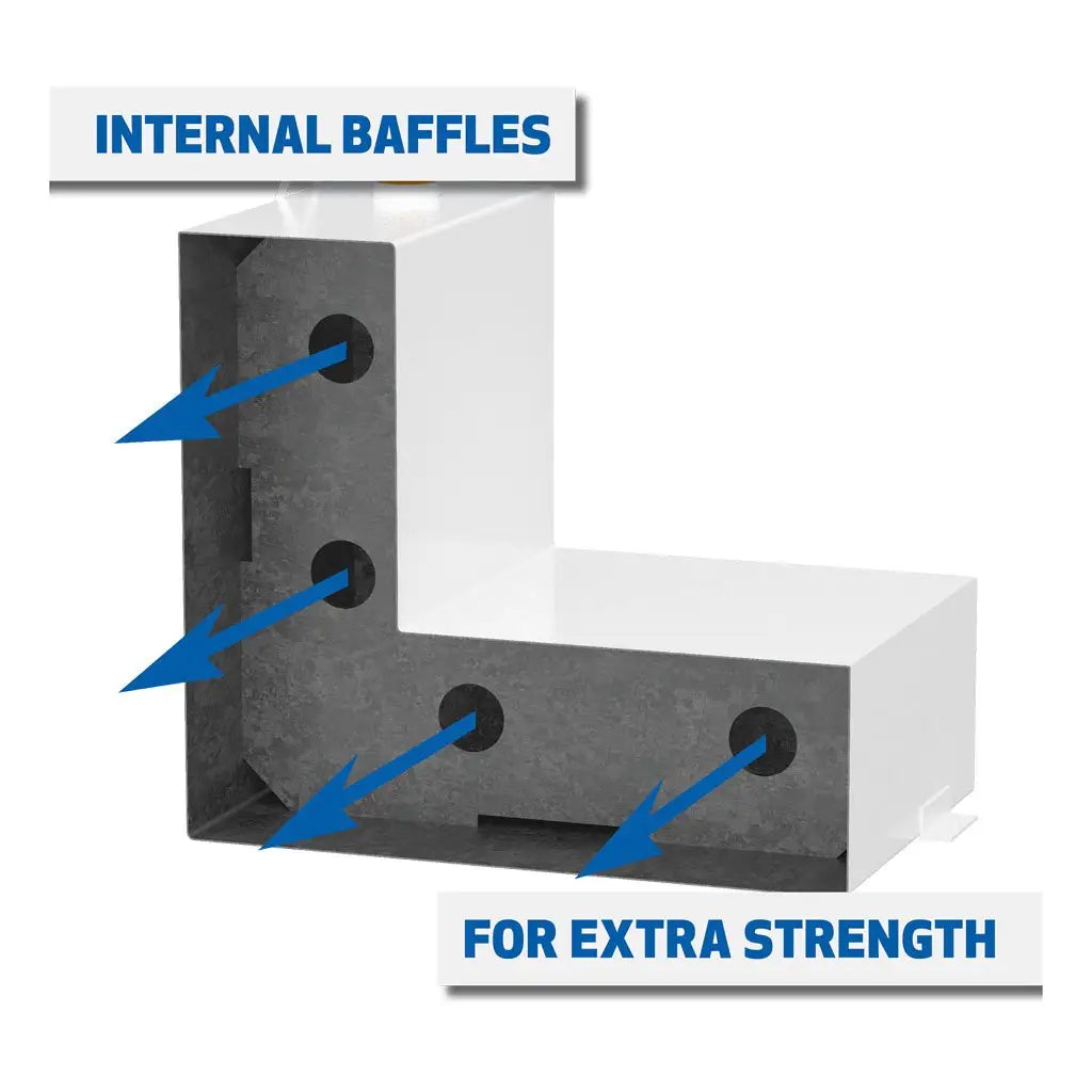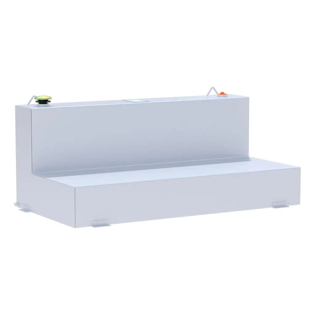 The UWS ST-100-L-W 100-Gallon Steel L-Shape Transfer Tank in White finish offers a heavy-duty solution for transporting non-flammable liquids while maximizing truck bed space. Constructed from 14-gauge steel with a smooth white powder coat, it features internal baffles to reduce liquid slosh, a lockable commercial-grade vented cap, built-in lift hooks, and welded mounting tabs for secure installation. Designed in an L-shape to leave room for a truck tool box and fully pressure-tested for reliable safety.