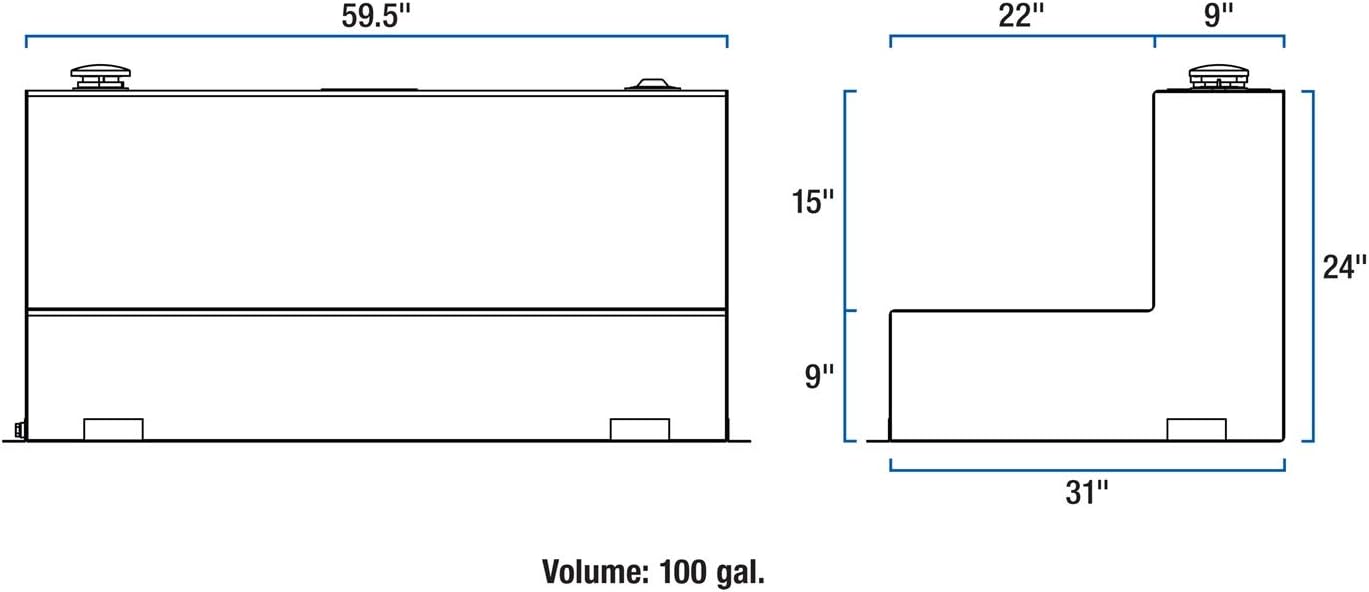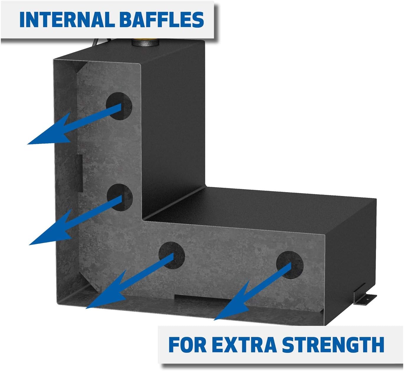 The UWS ST-100-L-MB Steel L-Shape 100-Gallon Transfer Tank in Matte Black is designed for heavy-duty truck bed use. Built with 14-gauge steel and finished in matte black powder coating, this L-shaped tank offers a high-capacity solution for transporting diesel or non-flammable liquids while maintaining a compact footprint. Internal baffles reduce sloshing, welded mounting tabs ensure secure installation, and lift-hooks add ease of handling.